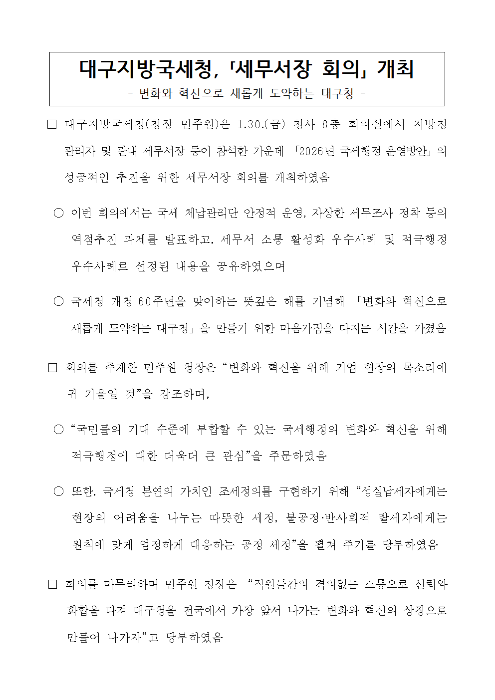 대구지방국세청, 「세무서장 회의」 개최