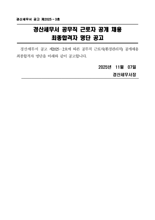 2025년 경산세무서 공무직 공개채용 최종합격자 공고