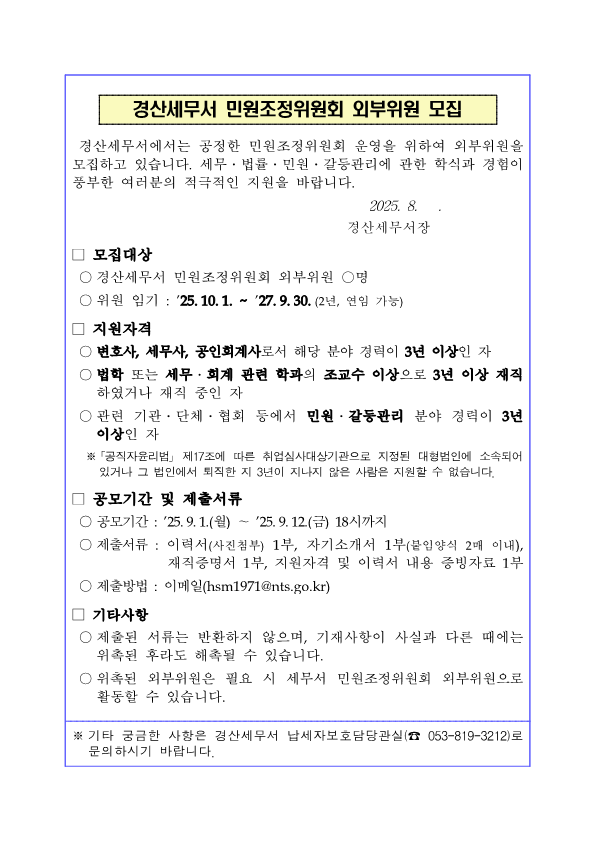 2025년 경산세무서 민원조정위원회 외부위원 모집