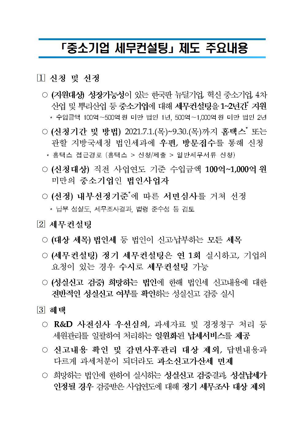 ○(지원대상) 성장가능성이 있는 한국판 뉴딜기업, 혁신 중소기업, 4차산업 및 뿌리산업 등 중소기업에 대해 세무컨설팅을 1~2년간* 지원