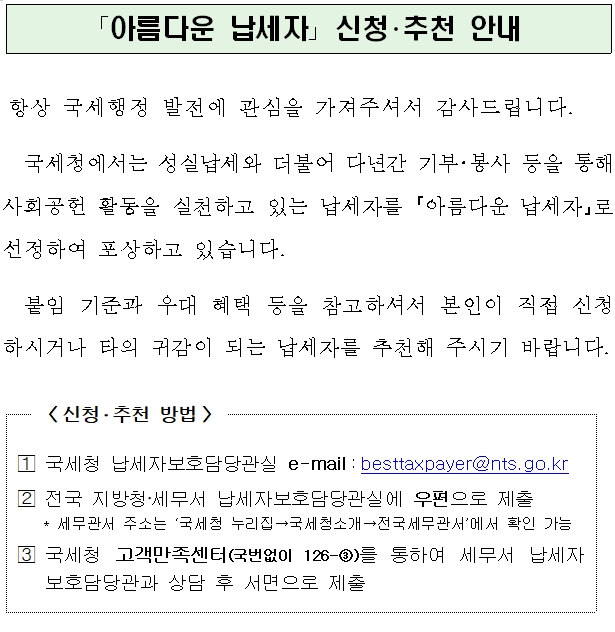 1번 국세청 납세자보호담당관실 e-mail:besttaxpayer@nts.go.kr