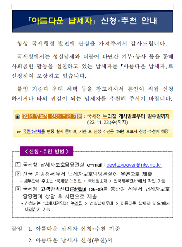 - 국세청 납세자보호담당관실 e-mail:besttaxpayer@nts.go.kr