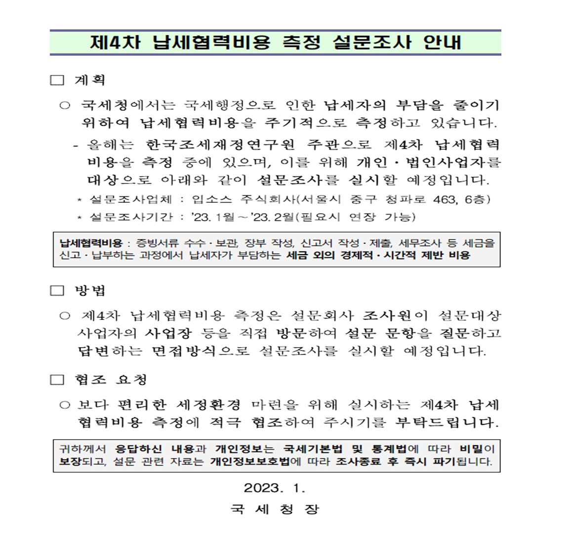 - 올해는 한국조세재정연구원 주관으로 제4차 납세협력 비용을 측정 중에 있으며, 이를 위해 개인 · 법인사업자를 대상으로 아래와 같이 설문조사를 실시할 예정입니다.