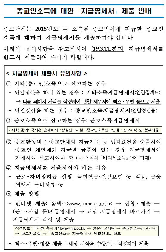 종교인소득에 대한 '지급명세서' 제출 안내