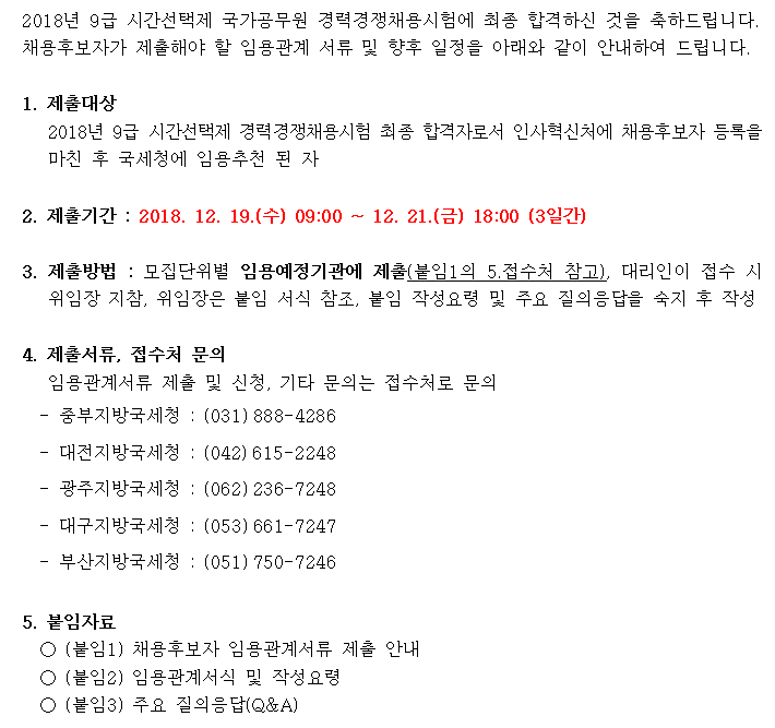 2018년 9급 시간선택제 경력경쟁채용시험 최종 합격자로서 인사혁신처에 채용후보자 등록을 마친 후 국세청에 임용추천 된 자
