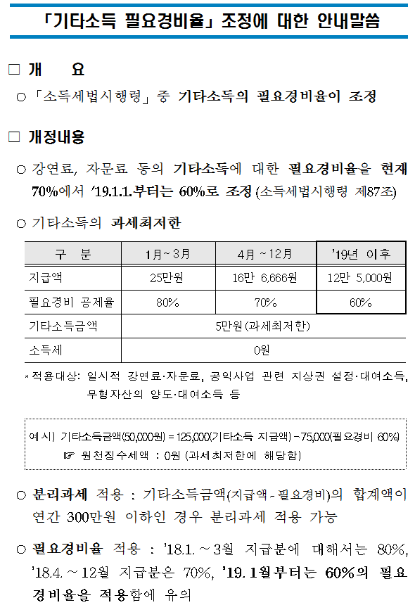 ○강연료, 자문료 등의 기타소득에 대한 필요경비율을 현재 70%에서 ’19.1.1.부터는 60%로 조정(소득세법시행령 제87조)