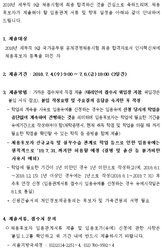 2018년 세무직 9급 채용시험에 최종 합격하신 것을 진심으로 축하드리며, 채용