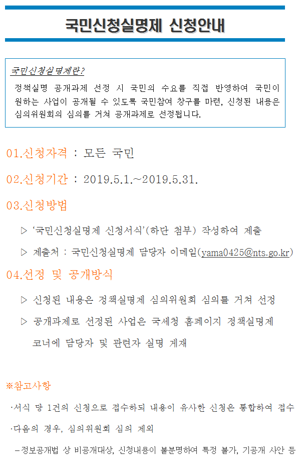 ▷ 제출처 : 국민신청실명제 담당자 이메일(yama0425@nts.go.kr)