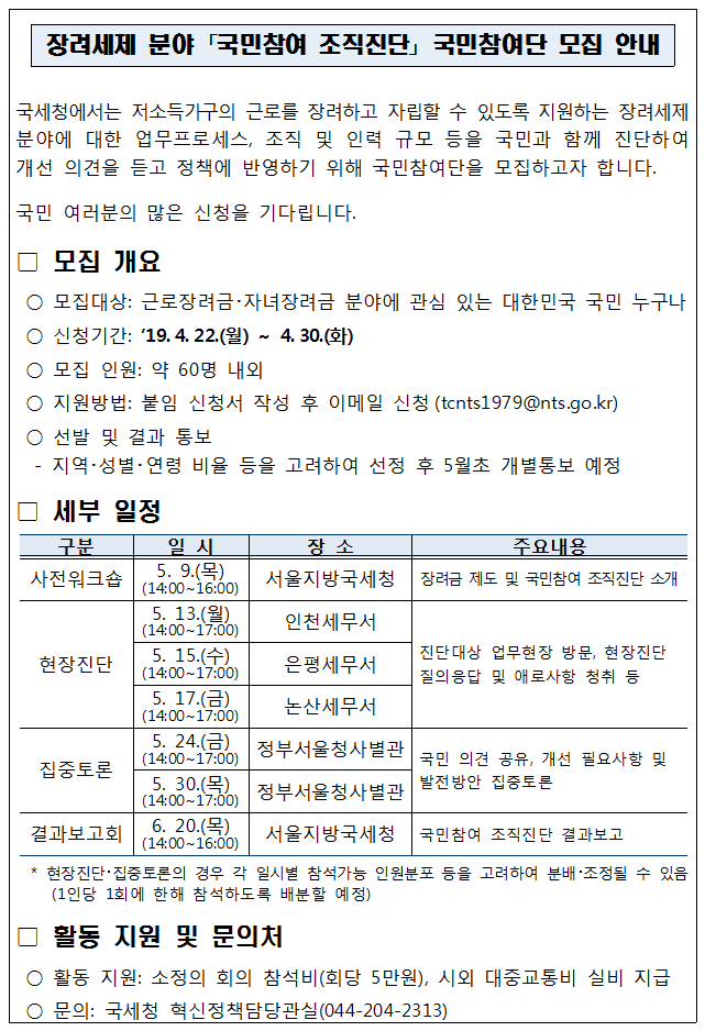 국세청에서는 저소득가구의 근로를 장려하고 자립할 수 있도록 지원하는 장려세제 분야에 대한 업무프로세스, 조직 및 인력 규모 등을 국민과 함께 진단하여 개선 의견을 듣고 정책에 반영하기 위해 국민참여단을 모집하고자 합니다.