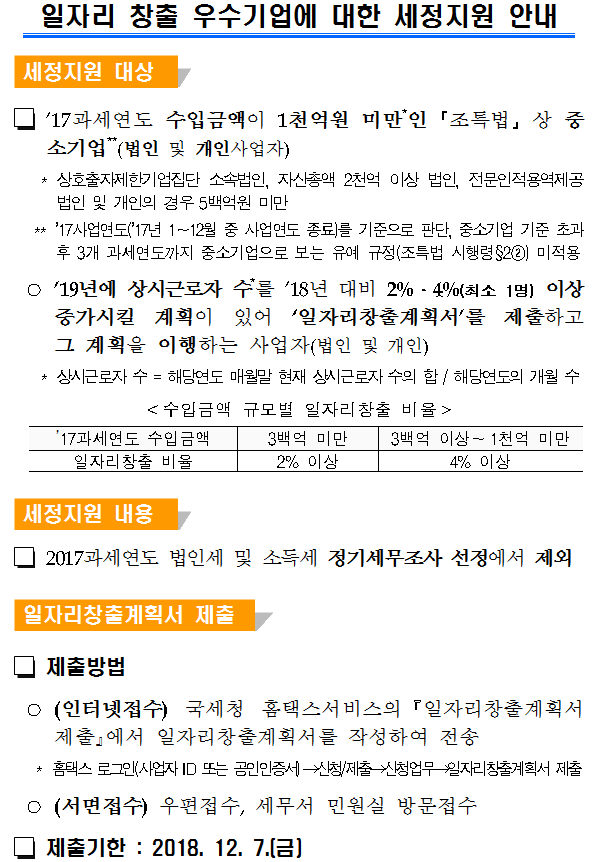 ○’19년에 상시근로자 수*를 ’18년 대비 2%?4%(최소 1명) 이상 증가시킬 계획이 있어 ‘일자리창출계획서’를 제출하고 그 계획을 이행하는 사업자(법인 및 개인)