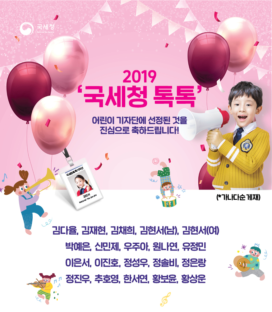 2019 '국세청 톡톡' 어린이 기자단에 선발되신 것을 진심으로 축하드립니다. *가나다순 게재 김다율, 김재현, 김채희, 김현서(남), 김현서(여) 박예은, 신민제, 우주아, 원나연, 유정민 이은서, 이진호, 전성우, 정솔비, 정은랑 정진우, 추호영, 한서연, 황보윤, 황상운