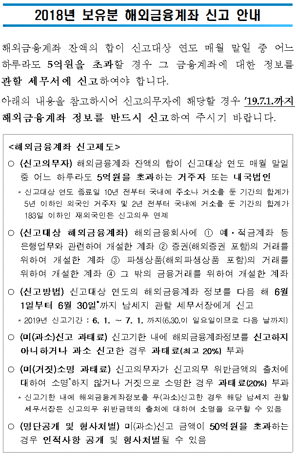 아래의 내용을 참고하시어 신고의무자에 해당할 경우 ’19.7.1.까지 해외금융계좌 정보를 반드시 신고하여 주시기 바랍니다.