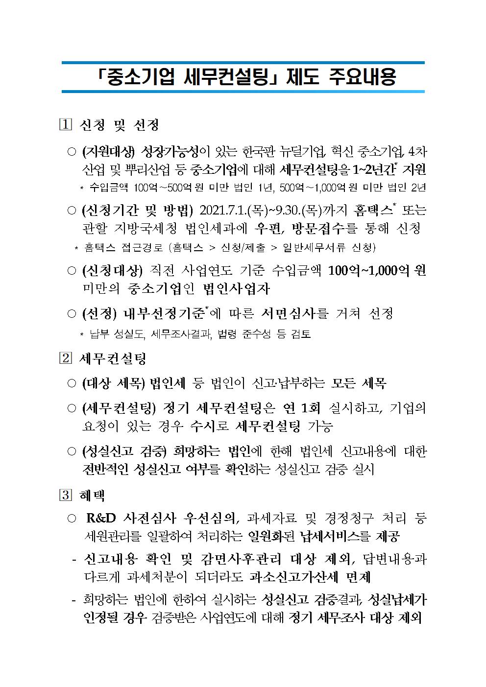 ○(지원대상) 성장가능성이 있는 한국판 뉴딜기업, 혁신 중소기업, 4차산업 및 뿌리산업 등 중소기업에 대해 세무컨설팅을 1~2년간* 지원
