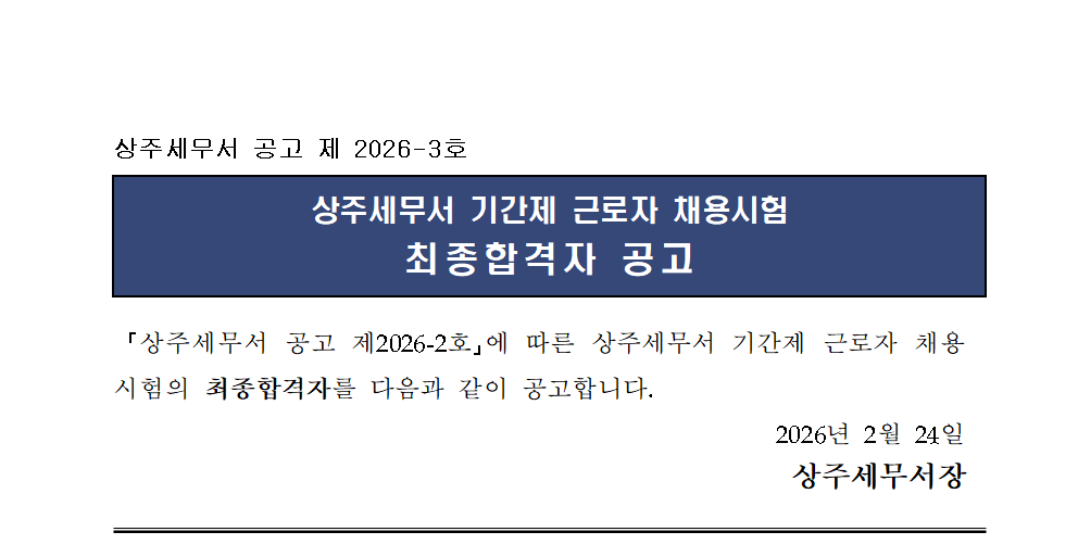 상주세무서 기간제 근로자 공개채용 최종합격자를 붙임과 같이 공고합니다.