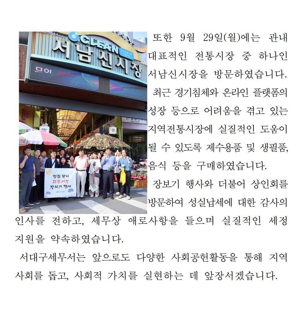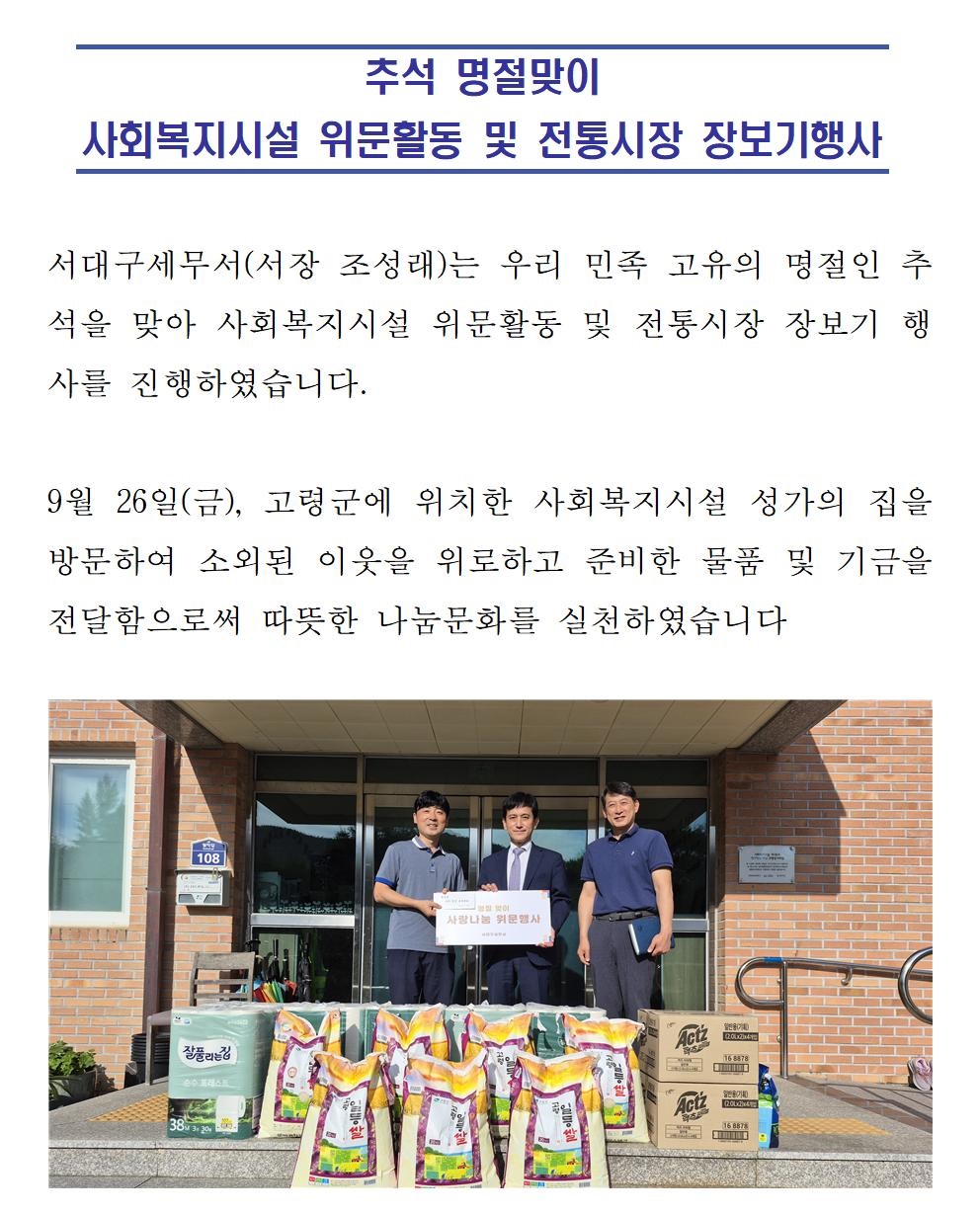 서대구세무서, 추석맞이 사회복지시설 위문활동 및 전통시장 장보기 행사 실시