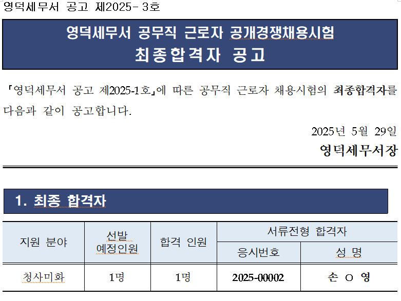 [영덕세무서 공무직 근로자 공개경쟁채용시험] 최종합격자 공고