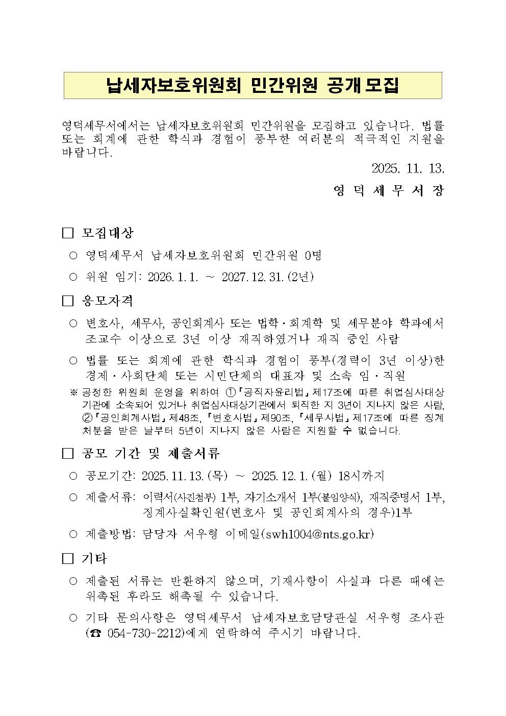 영덕세무서 납세자보호위원회 민간위원 공개모집