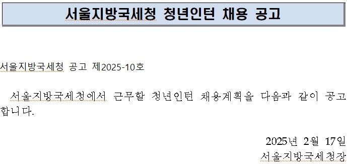 (공고 제2025-10호) 서울지방국세청 청년인턴 채용 공고